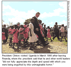 In March 1998, President Clinton acknowledged in a visit to Rwanda that "we did not act quickly enough" to stop the slaughter of up to a million people.
